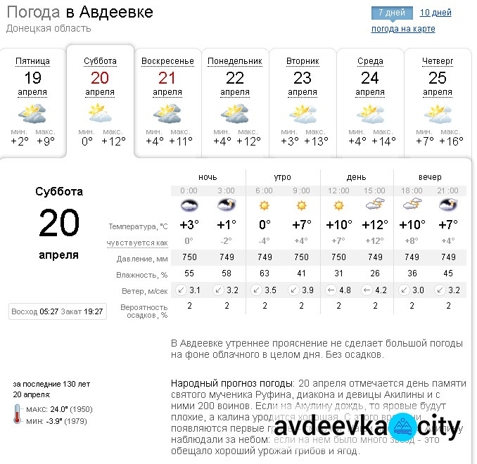 По данным Укргидрометцентра, 20 апреля на Донетчине прогнозируются заморозки в воздухе 0-3° (II уровень опасности, оранжевый). В Авдеевке в выходные будет облачная погода, без осадков.