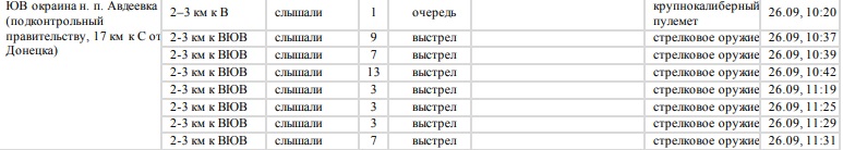 Кроме того, 26 сентября, в период с 10:20 до 11:31, наблюдатели СММ слышали многочисленные выстрелы на юго-восточной окраине Авдеевки.