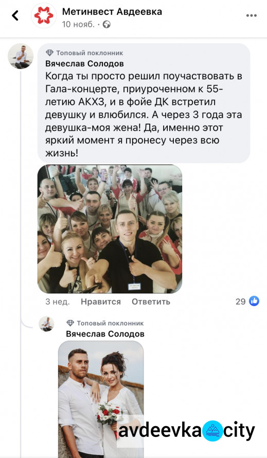 Ко Дню рождения Авдеевского коксохимического завода сотрудники имели возможность рассказать о своей работе на градообразующем предприятии, приняв участие в онлайн-конкурсе. Так, более 40 коксохимиков поделились трогательными моментами своей «заводской» жизни, оставив комментарии с памятными фотографиями и подписями к ним на странице Метинвест Авдеевка в Facebook. Победителями стали машинист коксовых машин КЦ№2 Вячеслав Солодов, лаборант химического анализа центральной заводской лаборатории Валентина Чехова и слесарь КИПиА цеха автоматизации производственных процессов Александр Коваленко.