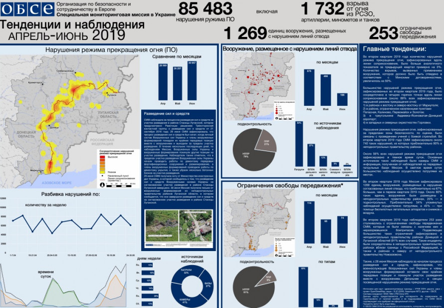 Представители Специальной мониторинговой миссии ОБСЕ в Украине сообщили, что за три месяца (апрель, май, июнь) в Донецкой и Луганской областях зафиксировано 85 483 нарушения режима прекращения огня.
