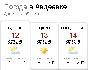 В субботу, 12 октября, в Авдеевке ясное с утра небо в середине дня затянется облаками. После этого погода будет пасмурной до самого вечера. Без осадков. Температура воздуха в Авдеевке сегодня: от + 5 по Цельсию ранним утром до + 15 днем.