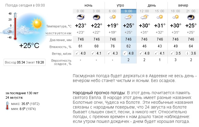 Сегодня, 24 августа, в Авдеевке некоторое время будет пасмурная погода, но ближе к вечеру, когда намечены праздничные мероприятия, небо станет чистым и ясным. Минимальная температура была сегодня ранним утром (+19), максимум ожидается к обеду (+31).
