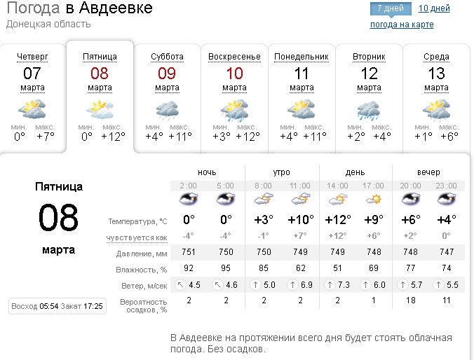 10 марта авдеевцам, опять же, прогнозируют облачную погоды. Днем возможен дождь, который закончится еще до наступления вечера. Утром + 6, днем + 12, вечером +9.