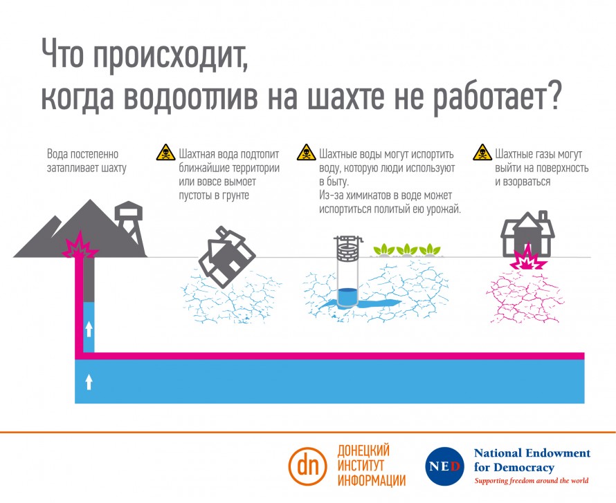 Он рассказал, чем опасны такие шахты: «Если не делать принудительного водоотвода, тогда начинается неконтролируемое затопление. Исходя из того, что шахты разными ходами и проходками в том числе связаны между собой в очень большую разветвленную сеть, то грунтовые воды, которые начали скапливаться на неконтролируемой территории, они могут рано или поздно начать затапливать те шахты, которые расположены на территории, подконтрольной украинскому правительству».