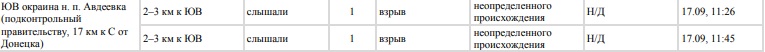 Также в таблице НРПО приведены данные о том, что 17 сентября в 11:26 и в 11:45 на юго-восточной окраине Авдеевки наблюдатели слышали взрывы неопределенного происхождения.