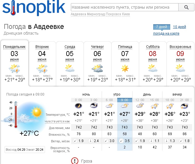 Сегодня, 3 июня, в Донецкой области ожидается ухудшение погодных условий. Зацепит оно и Авдеевку.
