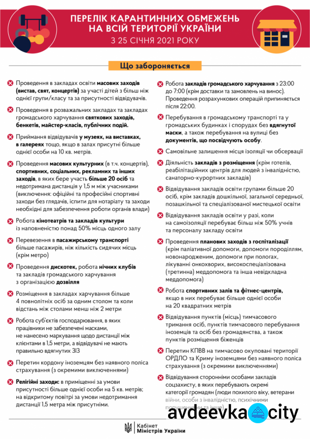 Україна 25 січня виходить із посиленого карантину і повертається до карантинних обмежень, які діяли у грудні, повідомляє avdeevka.city.