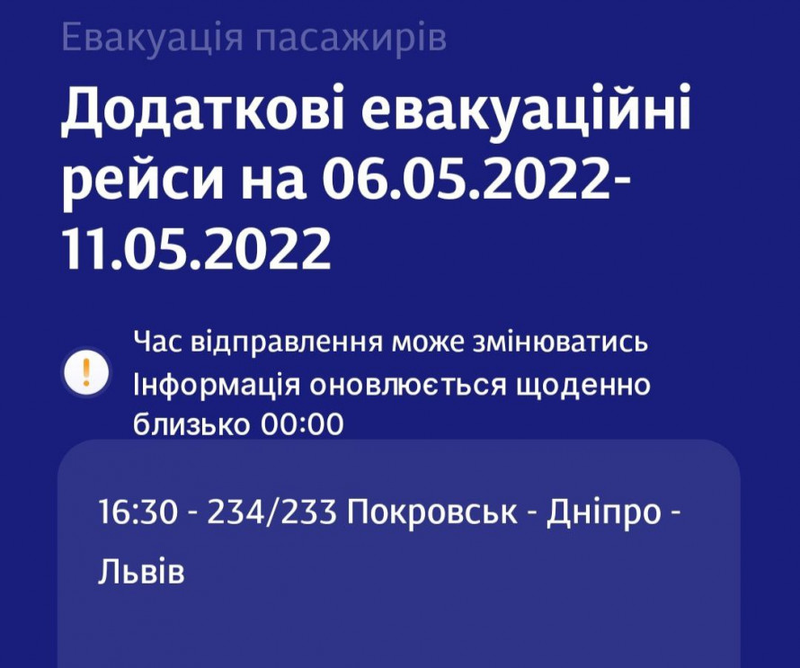 "Укрзалізниця" опублікувала графік додаткових евакуаційних рейсів з Покровська. Так, потяг 234/233 Покровськ - Дніпро - Львів курсуватиме щоденно до 11 травня включно. Час відправлення - 16.30.