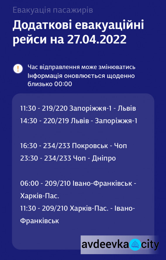 «Укрзалізниця» призначила шість евакуаційних поїздів на 27 квітня 27 квітня 2022 о 07:45 2022-04-27 07:45:00 «Укрзалізниця» оприлюднила графік евакуаційних поїздів на середу, 27 квітня, повідомляє пресслужба компанії.