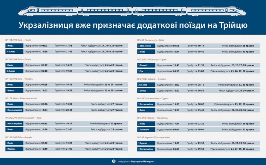 Поезд № 747/748 Киев - Тернополь в дополнительный рейс отправится 26 мая в 17:24 и прибудет в Тернополь в 23:25. В обратном направлении 27 мая поезд отправится в 4:04 и прибудет в Киев в 10:01.