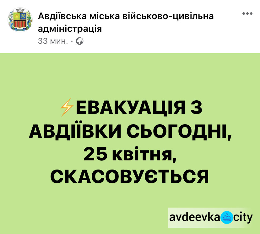 За інформацією Авдіївської міської військової адміністрації сьогодні, 25 квітня, скасовується евакуація мешканців з міста.