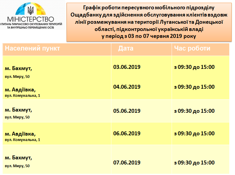 По данным пресс-службы Министерства по вопросам временно оккупированных территорий и внутренне перемещенных лиц, Ощадбанк на колесах приедет в Бахмут 3, 5 и 7 июня, а в Авдеевку – 4 и 6 июня. Время работы - с 09:30 до 15:00.