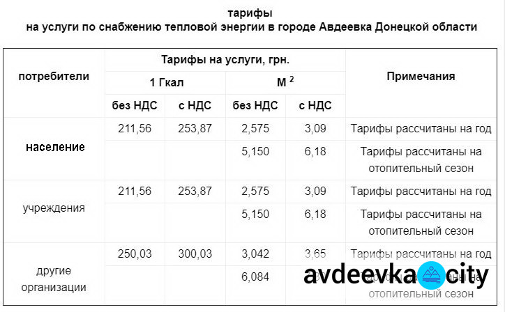 Согласно распоряжению руководителя военно-гражданской администрации города Авдеевка № 394 от 28 апреля «Об установлении тарифов на услуги по снабжению тепловой энергией в городе Авдеевка Донецкой области» с 15 мая 2020 устанавливаются следующие тарифы: