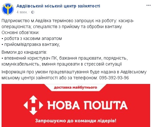 «Информация об условиях трудоустройства будет предоставлена в Авдеевском городском центре занятости или по телефону: 095-392-93-96», - отмечается в сообщении, которое снабжено логотипом «Новой почты».