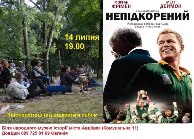 14 июля в 19:00 возле Народного музея истории города Авдеевка будет показана спортивная драма «Непокоренный». Это фильм о времени после падения апартеида, когда Южная Африка провела у себя Кубок мира по регби 1995 года. Тогда шел первый президентский срок Нельсона Манделы, который пытался использовать все возможности, чтобы прекратить многолетнее непонимание между белым и чернокожим населением страны. Режиссером ленты выступил легендарный Клинт Иствуд, в ролях - Морган Фримен, Мэтт Деймон и другие.
