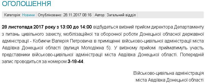 Сегодня, 28 ноября, в Авдеевке состоится выездной прием директора Департамента по вопросам гражданской защиты, мобилизационной и оборонной работы Донецкой облгосадминистрации - Валерия Кобыжчи.