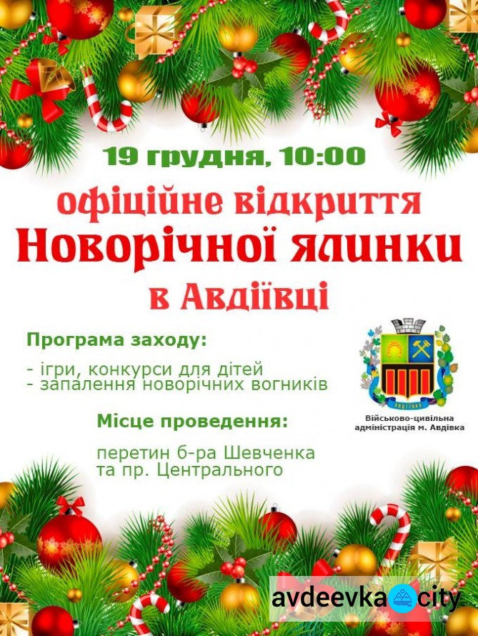 Официальное открытие и зажжение праздничных огней на новогодней ёлке города Авдеевка состоится 19 декабря в 10 утра на пересечении бульвара Шевченко и пр. Центральный.