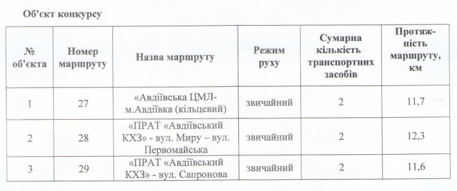 После проведения конкурса по перевозке пассажиров на городском автобусном маршруте общего пользования № 28 «ЧАО« Авдеевский КХЗ» - ул. Мира - ул. Первомайская» победителем признали КП «Авдеевское трамвайно-транспортное управление». С ним будет заключен договор сроком на три года.