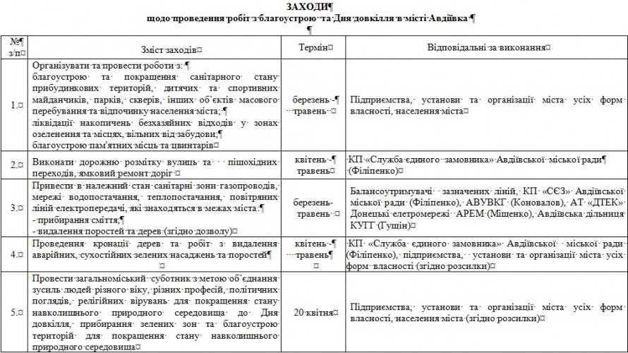 Распоряжение с целью наведения надлежащего порядка на территории Авдеевки после зимнего периода подписал руководитель военно-гражданской администрации города Павел Малыхин.