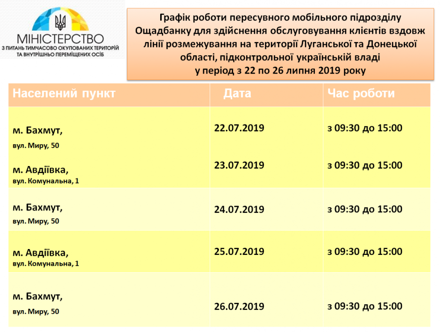 По данным пресс-службы Министерства по вопросам временно оккупированных территорий и внутренне перемещенных лиц, Ощадбанк на колесах в оставшиеся дни недели приедет в Бахмут 24 и 26 июля (пр. Мира, 50), а в Авдеевку – 25 июля (ул. Коммунальная, 1). Время работы - с 09:30 до 15:00.