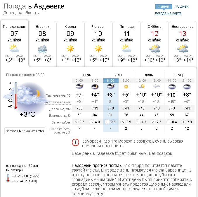 Сегодня, 7 октября, весь день в Авдеевке будет облачным. Без осадков. Температура - от + 3 по Цельсию ранним утром до + 10 днем.