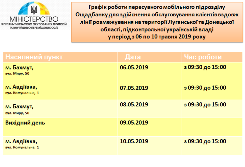 С 6 по 10 мая мобильное подразделение (МП) Ощадбанка будет обслуживать клиентов вдоль линии разграничения в Донецкой области, сообщает avdeevka.city.