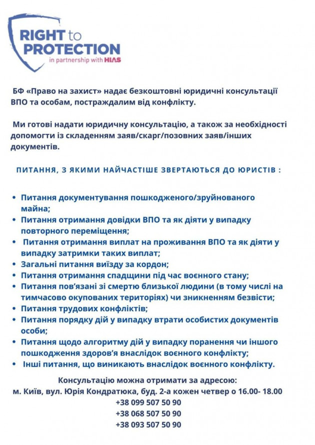 БФ "Право на захист" надаватиме безкоштовні юридичні консультації ВПО та іншим особам, які постраждали від війни у приміщені Авдіївської лікарні у Києві.