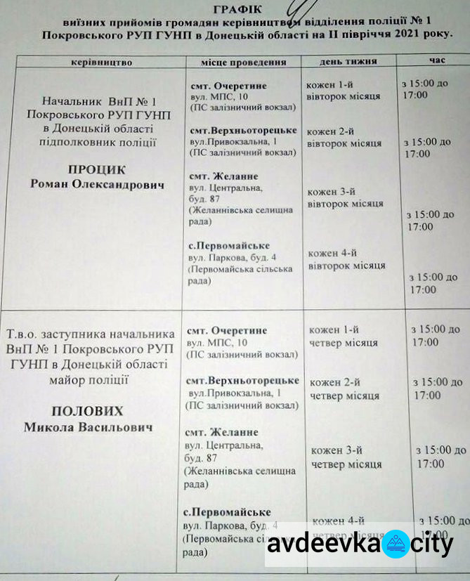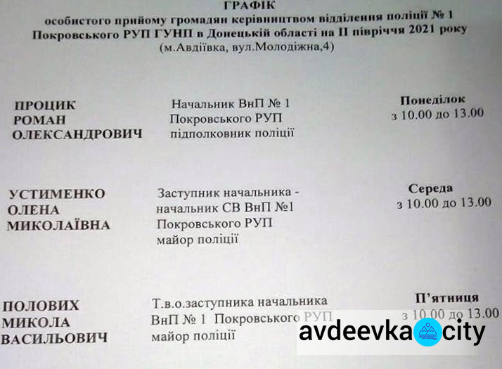 Прийоми громадян керівництвом відділення поліції №1 Покровського районного управління поліції ГУНП в Донецькій області здійснюється за адресою: вул. Молодіжна, буд. 4, повідомляє avdeevka.city з посиланням на сторінку у ФБ поліції Авдіївки.
