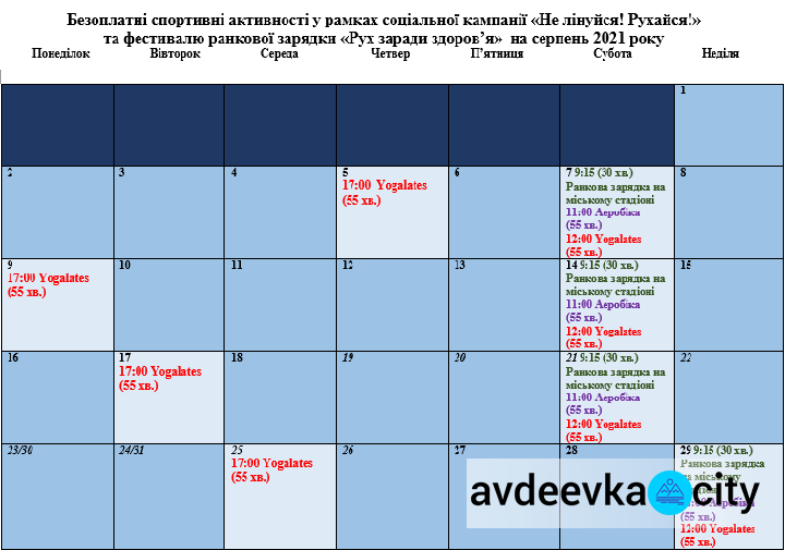 Міський центр фізичного здоров’я населення «Спорт для всіх» запрошує городян на безоплатні тренування з фітнес-направлень YOGALATES та FitBall у рамках проведення соціальної кампанії «Не лінуйся! Рухайся!», повідомляє avdeevka.city.