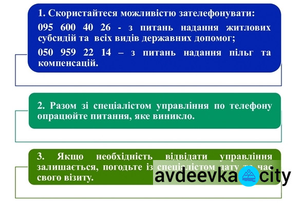 УСЗН Авдіївки продовжує працювати у штатному режимі. Для того, щоб спланувати свій візит до управління, необхідно дотримуватися наступного алгоритму: