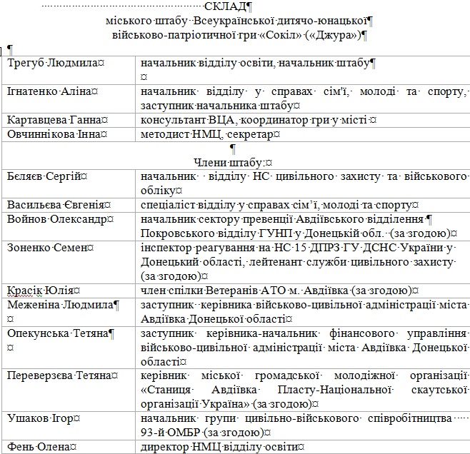 В прифронтовій Авдіївці затвердити склад міського штабу Всеукраїнської дитячо-юнацької військово-патріотичної гри «Сокіл» («Джура»).