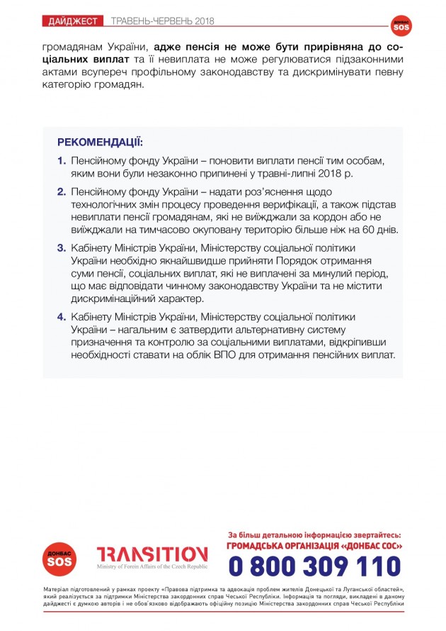 - Пенсионному фонду Украины - возобновить выплаты пенсии тем лицам, которым они были незаконно прекращены в мае-июле 2018. А также предоставить разъяснения относительно технологических изменений процесса проведения верификации ВПЛ, а также оснований невыплаты пенсии гражданам, не выезжавших за границу или не выезжали на временно оккупированную территорию более чем на 60 дней;