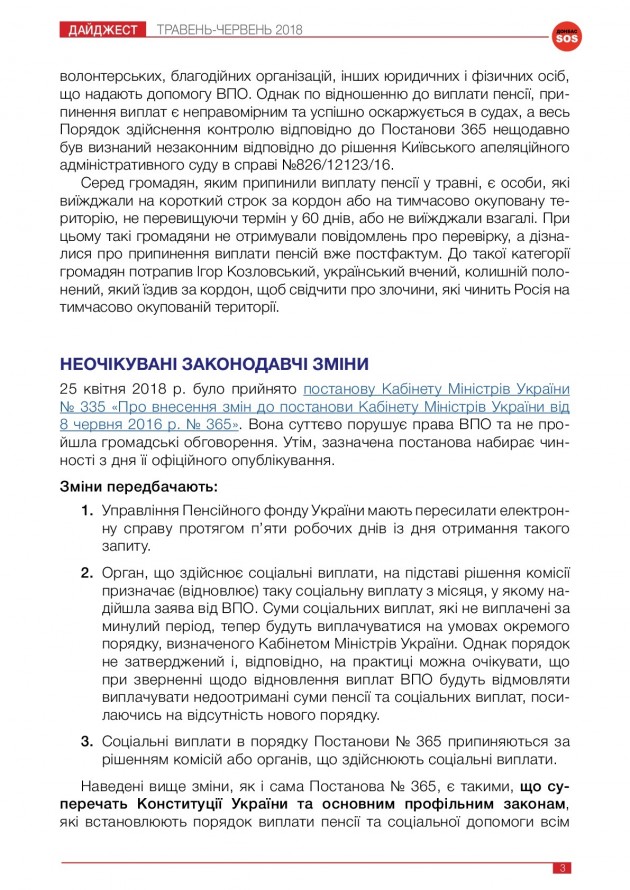 - Кабмину в целом и Министерству социальной политики Украины в частности - как можно быстрее принять Порядок получения суммы пенсии, социальных выплат, не выплаченных за прошедший период, который должен соответствовать действующему законодательству Украины и не содержать дискриминационных положений; утвердить альтернативную систему назначения и контроля за социальными выплатами, открепив необходимость становиться на учет ВПЛ для получения пенсионных выплат.