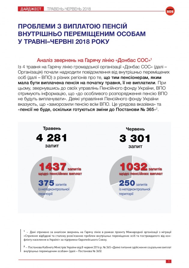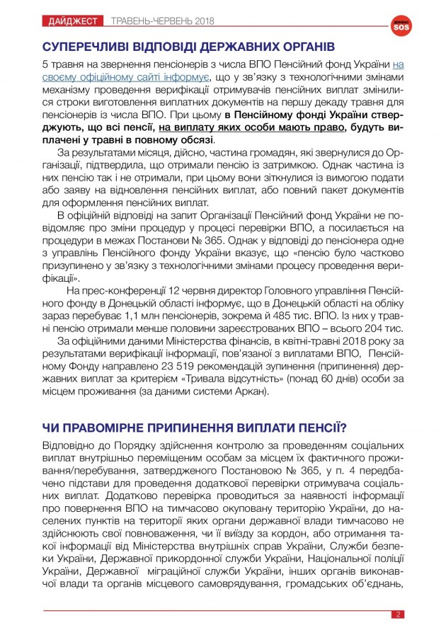 «Май отличился значительными задержками в выплатах, а также отменой пенсионных выплат полностью, в том числе и тем пенсионерам, кто выезжал только на короткий срок на временно оккупированную территорию или за границу, или не выезжал вообще, - напоминает ОО «Донбасс SOS». - Кроме того, Кабинет министров до сих пор не утвердил порядок за отсутствия которого пенсионерам не выплачивают задолженность за предыдущие месяцы».