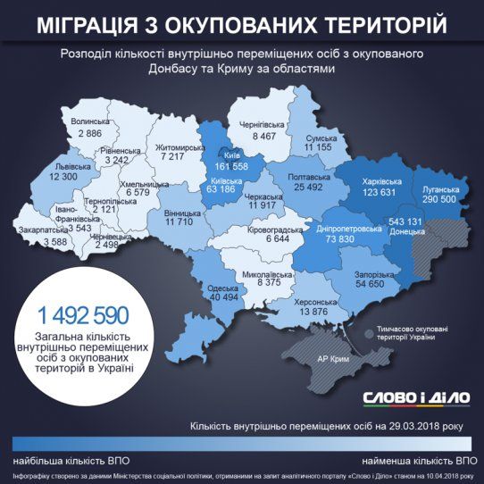 Количество внутренне перемещенных лиц (ВПЛ) в Украине в конце марта составило 1 млн 492 тыс. 590 человек. Их число продолжает расти в Киеве и Донецкой области.