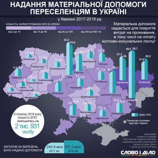 В прошлом месяце сумма выплат переселенцам для покрытия трат на проживание и оплату ЖКУ достигла 251,2 млн грн (для сравнения – в марте 2017 года – 244,8 млн грн). Лидируют по выплатам Донецкая область – 58,7 млн грн, Киев – 33,6 млн грн и Харьковская область – 26 млн грн.