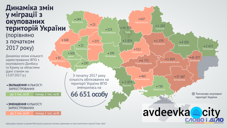 Как сообщает avdeevka.city со ссылкой на издание «Слово и Дело», за 6 месяцев 2017-го больше всего внутренне перемещенных лиц оставили Донецке и Запорожскую области: в Донецкой число ВПЛ снизилось почти на 46 000 человек, а в Запорожской - на 37,6 тысячи.