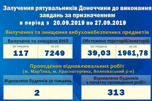 Спасатели Главного управления ГСЧС Украины в Донецкой области в период с 20 по 27 сентября проводили работы по очистке территории Донецкой области от взрывоопасных предметов, а также восстановительные работы.