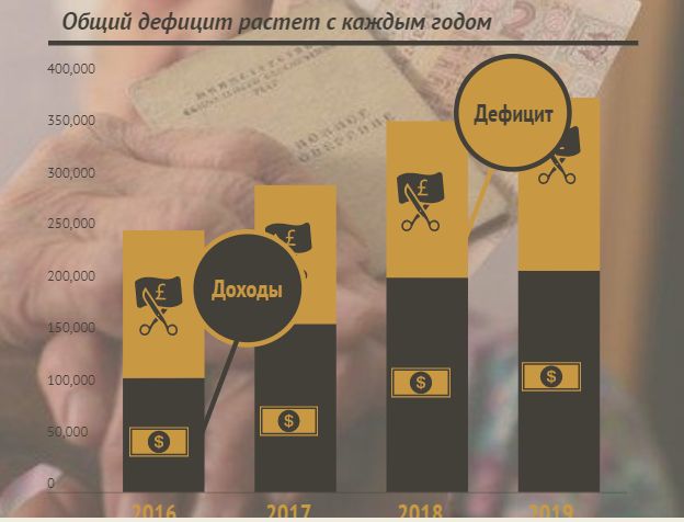 Между тем, дефицит Пенсионного фонда Украины растет с каждым годом. Причем каждый работающий украинец платит дважды. Первый раз – выплачивая единый социальный взнос в размере 22% своей зарплаты, а второй раз – оплачивая своими налогами огромную дыру в бюджете ПФУ. Только в 2019-м на покрытие дефицита направят из бюджета 167 млрд грн.