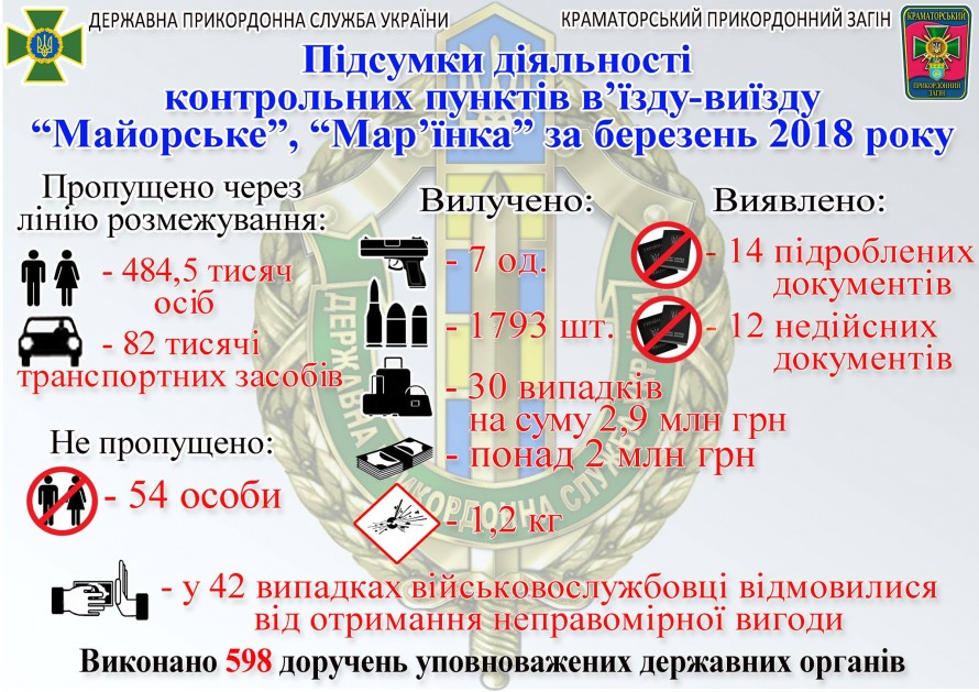 Краматорский погранотряд обнародовал мартовскую статистику по пересечению линии разграничения и нарушениям в КПВВ "Майорск" и "Марьинка".