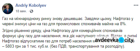 "Согласно решению правительства, цена "Нафтогаза" для коммерческих потребителей формирует цену газа для населения, которая действует в следующем месяце. Следовательно, в июле "Нафтогаз" будет отпускать газ для нужд населения почти на 8% дешевле", – сообщил Коболев.
