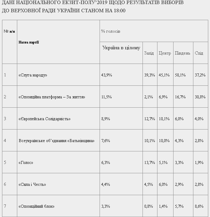 По данным "Национального экзит-полла 2019", проведенного Фондом "Демократические инициативы" имени Илька Кучерива, Киевским международным институтом социологии и Украинским центром экономических и политических исследований имени Александра Разумкова (данные на 18:00), в Верховную Раду Украины IX созыва проходят пять политических партий.
