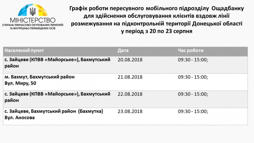 Министерством по вопросам временно оккупированных территорий и внутренне перемещенных лиц (ВПЛ) Украины опубликован график работы мобильных подразделений Ощадбанка в прифронтовой зоне Донетчины на следующей неделе. Учитывая, что 24 августа (пятница) – День независимости Украины (красный день календаря), МП Ощадбанка вместо традиционных 5 дней будет принимать 4.
