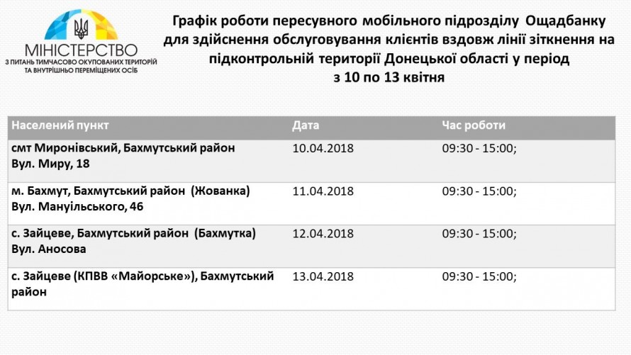 Сегодня, 6 апреля, Министерством по вопросам временно оккупированных территорий и внутренне перемещенных лиц (ВПЛ) Украины опубликован новый график работы мобильных подразделений Ощадбанка в прифронтовой зоне Донетчины.