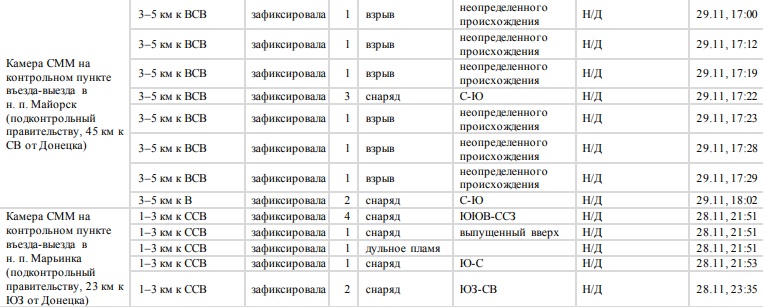 Согласно сводке СММ, обнародованной вечером 30 ноября и изученной сайтом avdeevka.city, камеры наблюдателей, установленные в КПВВ в районе Майорска и Марьинке (подконтрольная правительству часть Донетчины) фиксировали 28 и 29 ноября пролеты снарядов и взрывы неопределенного происхождения.