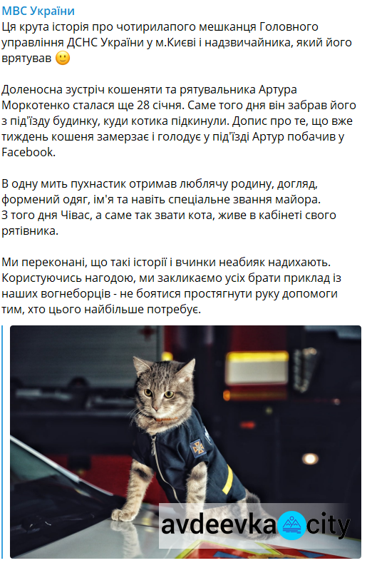 “Судьбоносная встреча котенка и спасателя Артура Моркотенко произошла еще 28 января. Именно в этот день он забрал его из подъезда дома, куда котика подбросили. Сообщение о том, что уже неделю котенок замерзает, и голодает в подъезде Артур увидел в Facebook “, – говорится в сообщении. С тех пор удачливый кот получил любящих семью и друзей, а также форменную одежду и даже специальное звание майора. Кота назвали Чивасом. Он проживает в кабинете своего спасателя.
