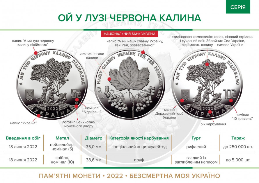В Україні вводять в обіг пам’ятні монети «Ой, у лузі червона калина» номіналом 5 і 10 гривень.