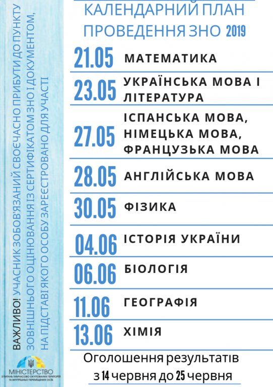 Министерство образования Украины разработало календарный план проведение внешнего независимого оценивания в 2019 году.