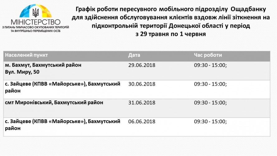 Сегодня, 29 мая, Министерством по вопросам временно оккупированных территорий и внутренне перемещенных лиц (ВПЛ) Украины опубликован график работы мобильных подразделений Ощадбанка в прифронтовой зоне Донетчины на этой неделе.