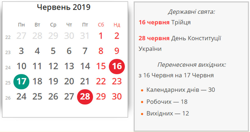 В июне украинцев ждет 18 рабочих дней и 12 официальных выходных и праздников. Кроме того, запланирован один предпраздничный короткий день.